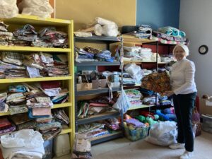 Every year a number of quilts go to Lutheran Social Services, which then go overseas. Locally the quilters give them to the men and women’s Rescue Mission, Every Woman’s Place, Samaritas for foster children and refugees, the Grand Rapids Veterans Home, Johnson Cancer Center, and baby blankets go to Muskegon Pregnancy Center.